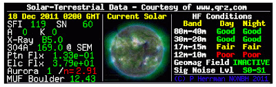 As you can see from the Solar Data Banner on the left, the SFI and other numbers were not the best on the 17th December. We've all seen a lot worse of course, but after the past few months of great DXing, it's hard to see it sink back to these levels again.